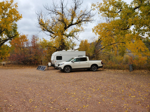 Very clean, basic campground. Pit toilets only. Central town water supply tap next to cooking shelter with wood stove. Nice private sites with tables and fire pits. Located next to Rosebud River in beautiful badlands setting.