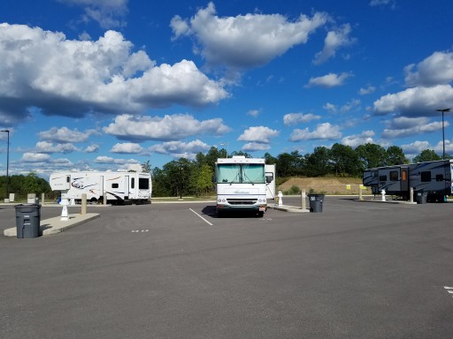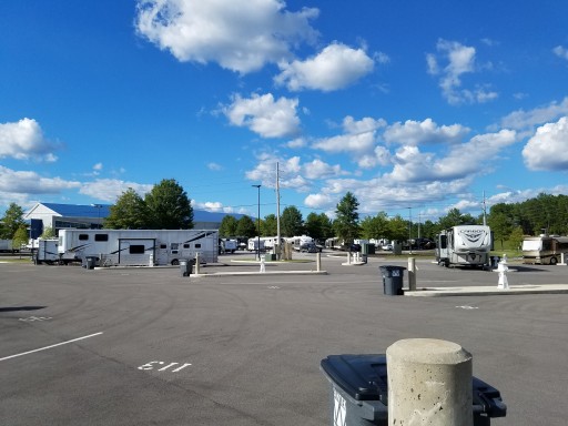 It's a flat, clean, well lit lot. HUGE playground that was just built last year for the kids right next to the RV lot. The power and water are conveniently located in a modern pedestal. The sewer is a little tricky to attach because you park on the asphalt and the sewer is up on the curbed island. So it takes a bit of work to get the required downward slope for gravity to do its job. Most people had something stacked on the asphalt to build up to the level of the curb. Each island has a large trash can.