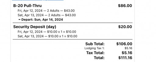 Management has refused to give us a refund of the site, or at least the next night plus there is some security fee that you also get charged.