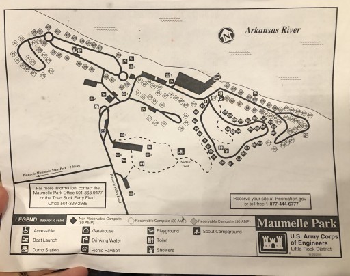 This Corps park is a gem. You will fall in love with it. Try to get a river site so you can pull in facing the water. Just have to use a longer water hose and electric cord, but the view is worth the effort. Getting to this park requires careful planning. Time your travel to avoid the insane rush-hours on the NW interstate around Little Rock.