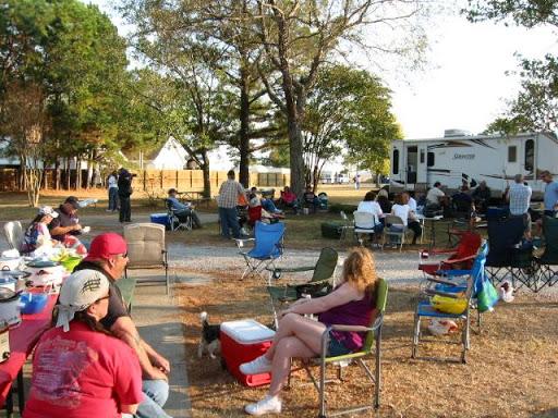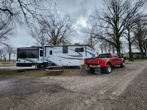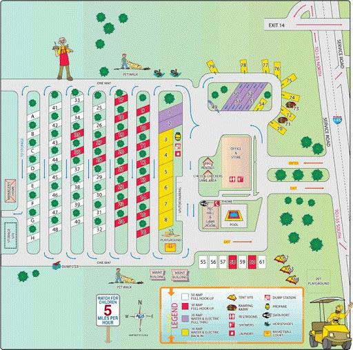 Made reservation here because original cg was flooded. I told them when I made the reservation that my rig is 60 ft long, they said no problem. I was just barely able to fit on the site. A lot of recent rain made this cg a bit swampy, but that’s nature and not the park. Roads are a bit tight and with a lot of swing, we could not put our slide out all the way. Good cable tv and good wi-fi. Frozen Digourno<sp> pizza was $15 delivered to your site. They also offer pulled pork sandwiches. Staff was courteous and friendly.