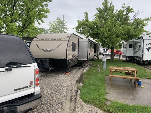 We were there for one night so we did not get the full park experience (restaurant was closed, used our RV for restroom facilities, no time to hang out at the pool). The park is very convenient to St. Louis and the arch. Staff were responsive and confirmed our late arrival. 3 stars as my site was standing in water/mud off the gravel parking pad. Called and they brought over a pallet for me to stand on while making connections. Made for a mess hooking up and unhooking utilities. Was not happy with electrical cable in standing water and mud. A refund was offered as there were no other available sites. I declined as we had plans in St. Louis shortly after our arrival. Checking out was not really a option so we made it work. Also, neighbors were in close proximity. Very tight spaces. Good Sam honored. Site was pretty level.