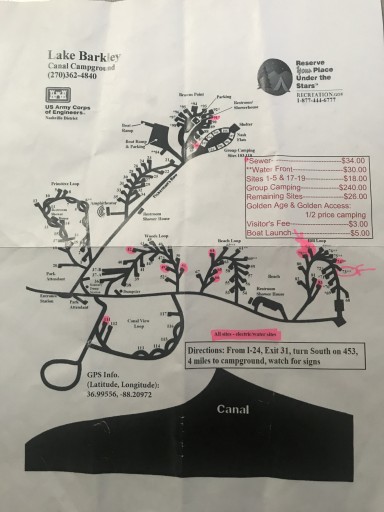 Online reservations only. We arrived after hours and had no trouble finding our spot #73. (Only avail for 1 night) Road was steep but we managed to get in ok with our 28’ Airstream. Found a couple spots available for the upcoming night (Thursday) so made another resv for spot #78. After walking around the entire campground we found that there really aren’t many “bad” spots with the exception of a few that have wash out. Canal View loop is all blacktop. Primitive loop is ok for smaller units and/or tents. Fisherman’s row has a few with water views and is a nice loop especially if you have a boat. There are 8 sites in Browns Point that have sewer hookup. ALL sites have water and electric. Group Camping is a nice loop for large Class A’s. All concrete but much like a big parking lot but plenty of space. Shelter and boat dock in this loop. Beach loop would be a great loop for kids as there is a playground and of course the beach. Although no water there now. Great campground for walking.
