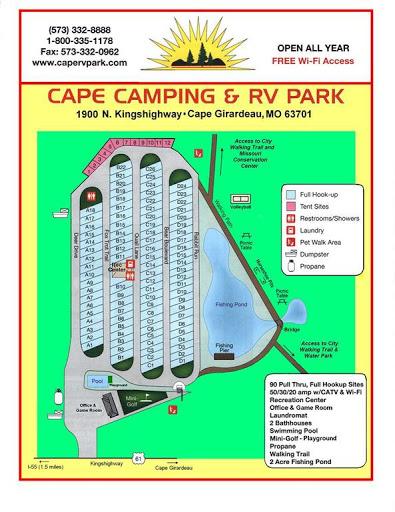 This is a nice campground in the city of Cape Girardeau but has the feeling of being in the country. It has a nice pond and adjacent to a trail that runs thru the city. Close to I-55 it a good spot for an overnight stay.