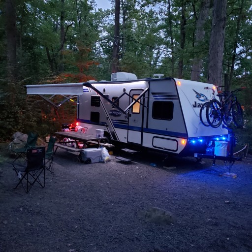 Modern utilities including 50 amp and water , situated at the edge of a parking lot where you park your rig. Dump station too. Just a few minutes off I-78 this is a convenient stop for me when I’m coming back home. Reserve online and they will let you know the procedure if you arrive after the park closes. The park is on a beautiful river front and is immaculate.