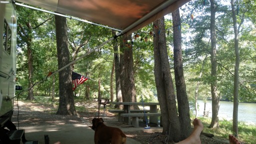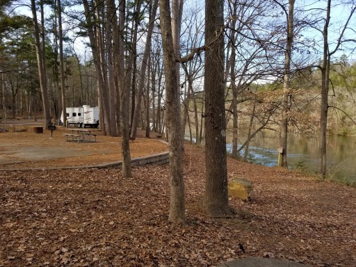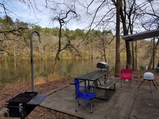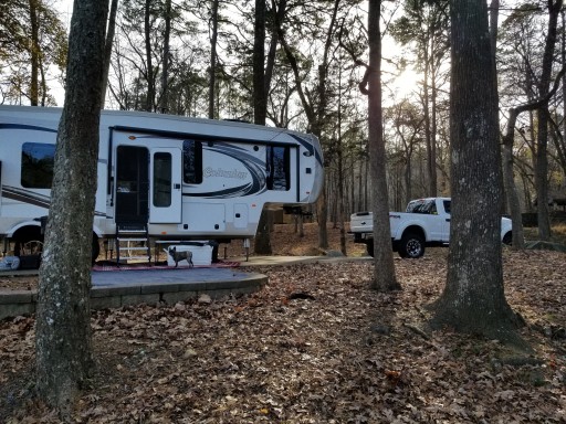 Set up in Armadillo -- full hookups, extremely tight for our 40' 5er. Then told Acorn area did have water frontage. Checked it out and moved. Water and electric only but we like the view of the river. They need RV parking at the Forest Heritage Center so you can talk to someone and get good info on the park's various areas. Phone help was bad. Much happier here.