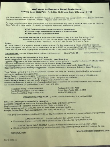 Today is 9/19/2019. We arrived at 5:10 pm yesterday afternoon. The park office was closed, so we grabbed a park map. On back of the map it listed the multiple rv campgrounds, and which were FCFS. We set up in Acorn 3, listed FCFS. This morning, when we went to the office to pay for our stay. When we got to the office the lady at the desk was not truly welcoming nor polite in letting us know that Acorn campground is now full reservation. I had tried to call multiple times prior to our stay to verify information before arriving, never was able to get through on the phone. Nowhere on the website did it show Acorn as reservation, nor did the gocampok.com website used for ok state park reservations. She had us move to acorn 12, which is truly a better site. However, with this change in policy, it should have been published. They could have at least posted a notice with the park maps at the entrance. This park is nice, but I feel they failed in informing visitors of policies.