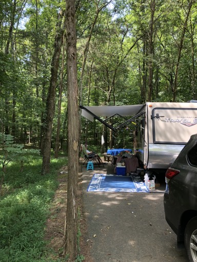 Nicely wooded Park. Well paved roads and site pads. Many, not all are level. Looks like recent improvements.Mix of shaded and partial. Concrete picnic tables- need to put down towel at seat to protect your clothing from snags. Firepit at each site. Bathhouses are spacous, cinder block constructed and plenty of hot water.