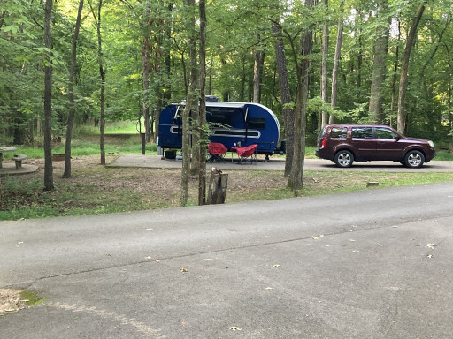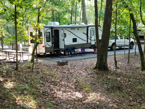 Nice park. Quiet and peaceful. I have 35' fifth wheel and had no problem. I saw some even longer and they had plenty of room too. Road has a lot of curves but is very manageable. Not all sites are level but all are asphalt. Nicely wooded and shade. Staff was nice. Restrooms were fairly clean and could have been a little better but they were ok. We will be back.