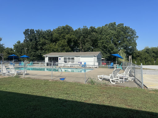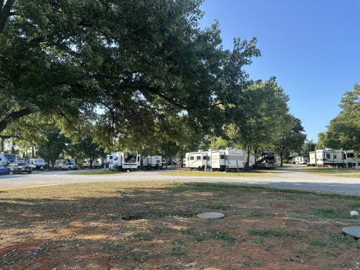 Nice clean park. Very easy on and off with wide streets inside with plenty of turning space. Laundry and bathrooms clean. Pool and hang out area very nice and clean. They have nice fire area as well and ping pong, jenga, kids swings. Nice little store inside for drinks, beer. Park is very noisy from i24 freeway traffic all hours. There is a dump across street in front of park, on hotter days does not smell so great up front. Nice shade trees, spots for big rigs fit our 40ft and truck no problem. Sites close but not bad. Verizon worked, wifi ok, better at times but that is normal. Close enough to everything that is Clarksville. And of course big military area so you have army helicopters fly over sometimes at night up to 11p. Had to use fan noise for sure here. Staff is great.