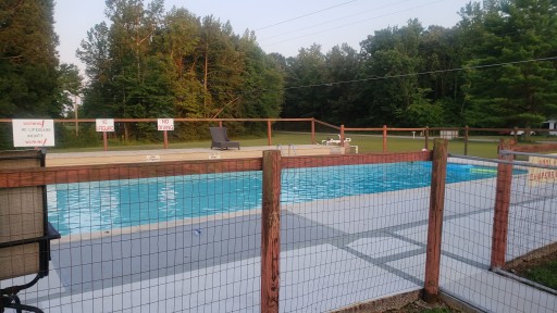 Nice shady mostly level gravel pads. We called ahead, and Keith reserved us a 50 amp pull thru for 1 night with a cc, payment in cash or check. Another courteous man led us to our site, easy in and out for our 34 ft motorhome pulling a truck. No highway noise, great mowed field, all dogs on leash, lovely swimming pool. Only downside was some junky sites of some obviously permanent parties. Did not use bath facilities.