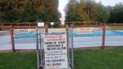 Park is very nicely groomed. Large play area for kids. Did not use the pool or the bathrooms. For 40$ (cash or check) it is a great place.