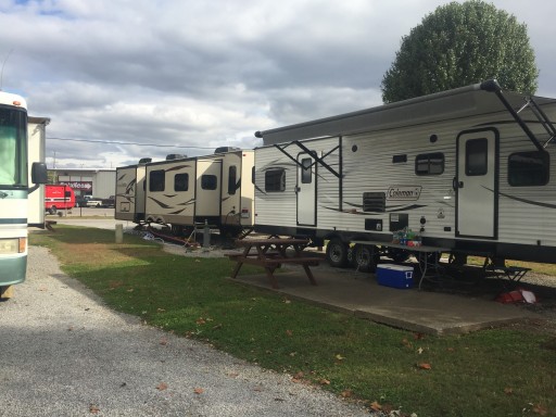 Squeezed between two RV sales lots, boarders Yogi Bear RV Park (which might be a better option) this RV Park has a total of three pull thru sites. If you want a pull thru call or reserve early. I would avoid site 314 which faces the dump station. Campers use the dump site all hours day & nite. Believe some come in really late to avoid paying a fee. Next time we hope to go elsewhere