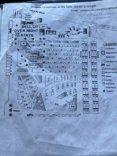 Long pull thrus but not all ate level...beware of overhanging tree branches before pulling in. Camp Host was friendly and helpful. Quiet on the weekends but being near the air strip, you'll have a continuous serenade of "the sounds of freedom" during the work week. This is a very clean base and easy to navigate in a 40' Class A with a tow.