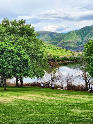 It's a short, paved walk to a small lake for swimming, fishing and floating in the sun and a gravel trail around the park boundary with views up and down the snake river. A large, covered picnic gazebo with tables and grills surrounded by a lawn.