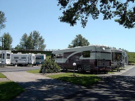Some if the other reviews here are bogus or meant for another park. This park is well off I-5 and more than a mile out of town so it is pretty quiet. It is entirely paved with wide streets and easy access for my 38 foot motorhome and tow vehicle. Pads are gravel and fairly level. Frontage on the Columbia river in a rural area with a sandy beach for strolling. A very large, well maintained lawn with shuffleboard and horseshoe pits. They also have a small on-site market. Friendly and helpful staff. When I was there the space between units was either dead grass or gravel. Overall, I would go back. Great place for bird watching for herons, eagles, and ospreys as well as a number of raptors in the farm fields.