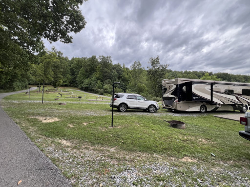 Great little spot to rest. Neat campground, with trimmed lawns, and roomy, level, gravel sites. Sun and some shade. Picnic table, fire ring, catch-and-release fish pond, and more- we just stayed the night on our way to Hatfield McCoy. Access from I-79 is a no problem WV ride for our 33’ class C with 18’ box trailer- well worth it.